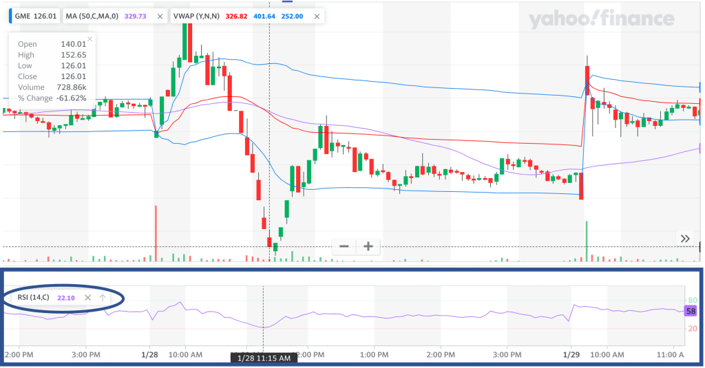 Here’s a 1-day trading cycle on GameStop on 1/28 during the heat of this week’s trading. RSI can be turned on in the indicators section in Yahoo Finance (blue box above), and the limits for overbought and underbought are set as 80 and 20 (in green and red) respectively. This shit is literally so easy. Around 11:15am, the RSI value is 22.10, close to the threshold of underbought, and literally right on cue the stock price surges. Pretty similar to what happens at around 10am as well, the stock is overbought, approaching RSI = 80, and the stock plummets. It’s simple supply and demand and is an excellent way of knowing when to take the plunge and assess risk.
