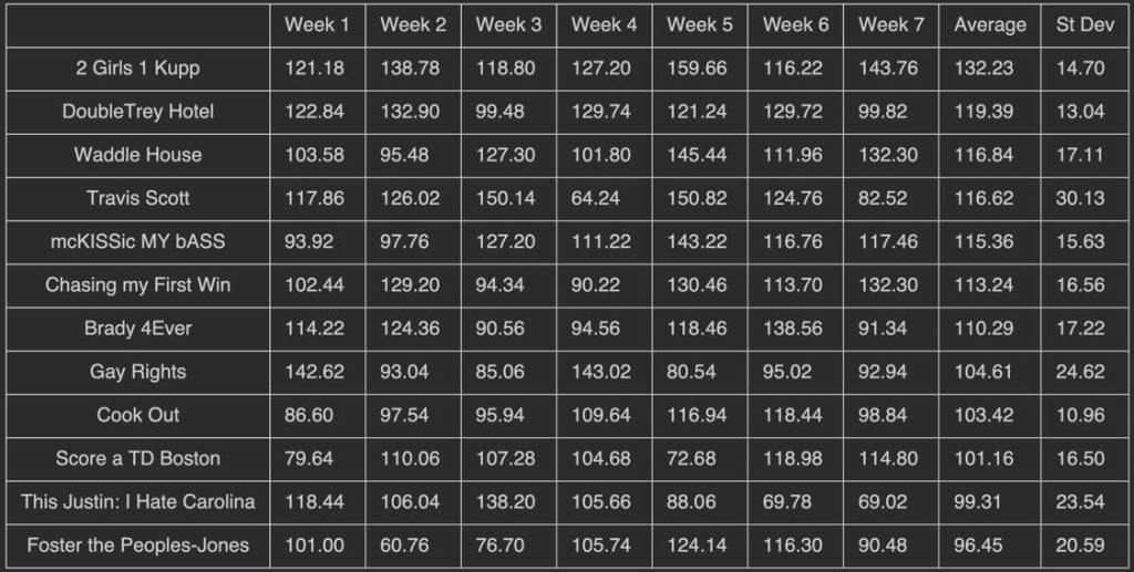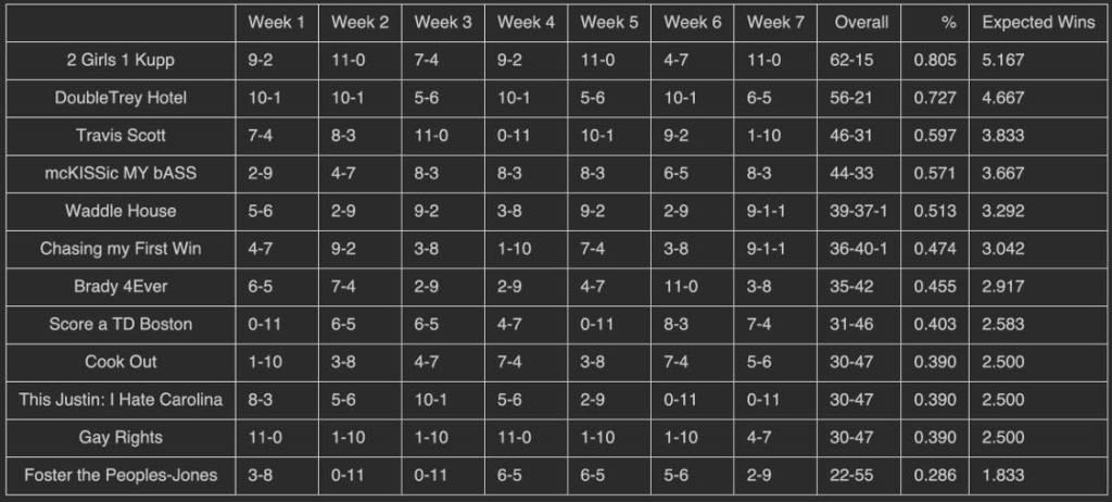 If there was ever a letdown spot on the season, it would be byemegeddon week 7 – only 9 points from the bench, nearly half the team on bye, and an important loss to a good opponent. Going 1-10 ATL is an anomaly, but stands as only the second time being sub-.500 ATL for the entire season. I don’t really expect problems moving forward as the roster talent and bye weeks should be easy to plug-and-chug. Big score opportunity can still be capitalized , and being tied for 3rd in average points scored leads to a better resume to make the playoffs as an expected top seed. Unfortunately, there cannot be other letdown spots, as an extremely important week 8 matchup against the best team in the league stands in the way of a 6-2 record.